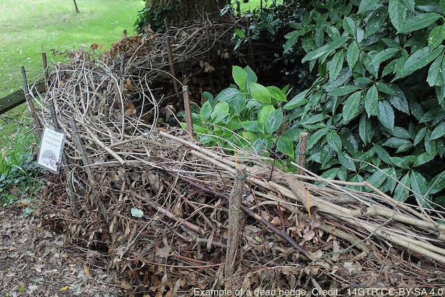 We’re planning to take advantage of a natural gap in the border hedge separating the fields, which provides a space to put brash — twigs and branches from the pruning and maintenance of trees and hedges. We will use these to build a “dead hedge” to contain green waste from the community garden for composting and for storing wood chip which will be used for regular mulching of the newly planted trees and hedges during their establishment. This will enhance biodiversity, by providing a great habitat for birds, insects, and other wildlife. We are making a start on preparing the area on Sunday 12 March, 2.00-4.00 p.m. — please join us if you can. Wear suitable clothing and garden gloves for dealing with branches and brambles; if you have them, please also bring loppers, pruning saws, or secateurs.