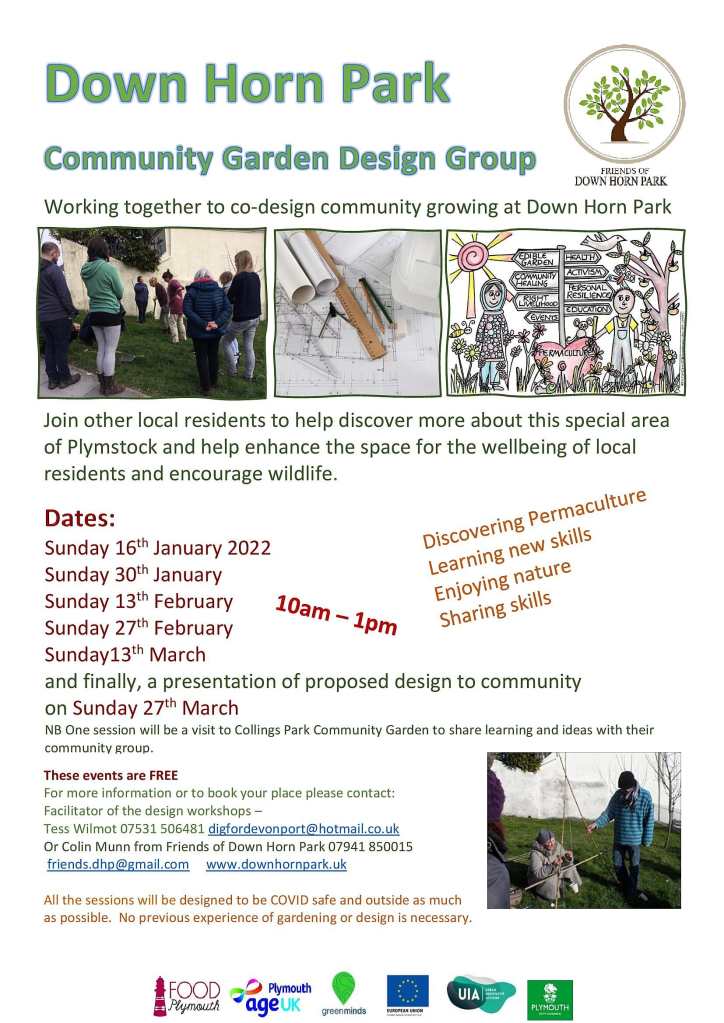 The Committee has begun our work to develop plans for 2022. Please take a look at the attached poster describing the fortnightly events beginning on 16 January. Come along to help to develop design options for the proposed Community Garden and ideas for the wider environmental improvements to the fields. These are being run by permaculture expert Tess Wilmot, who has successfully led several similar ventures in Plymouth and South Devon. If you are interested in attending some or all of these sessions, please contact Tess digfordevonport@hotmail.co.uk