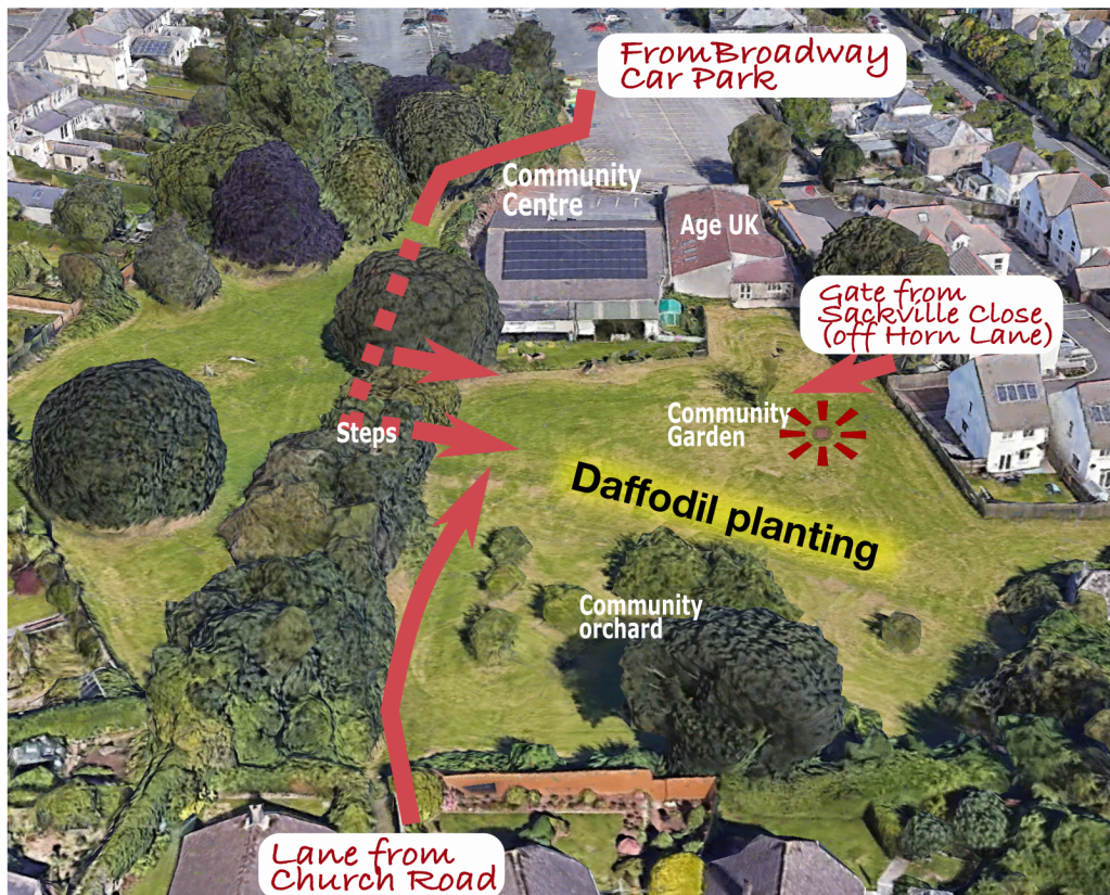 This autumn, Friends of Downhorn Park (FoDHP) are planting 1000 mixed daffodil bulbs on the sloping bank in the Lower Field. This will create a stunning display of colour in the Spring. The bulbs will will be planted in a strip about 0.5 x 26 m. Next year, we’re planning to establish patches of wildflowers on the bank.