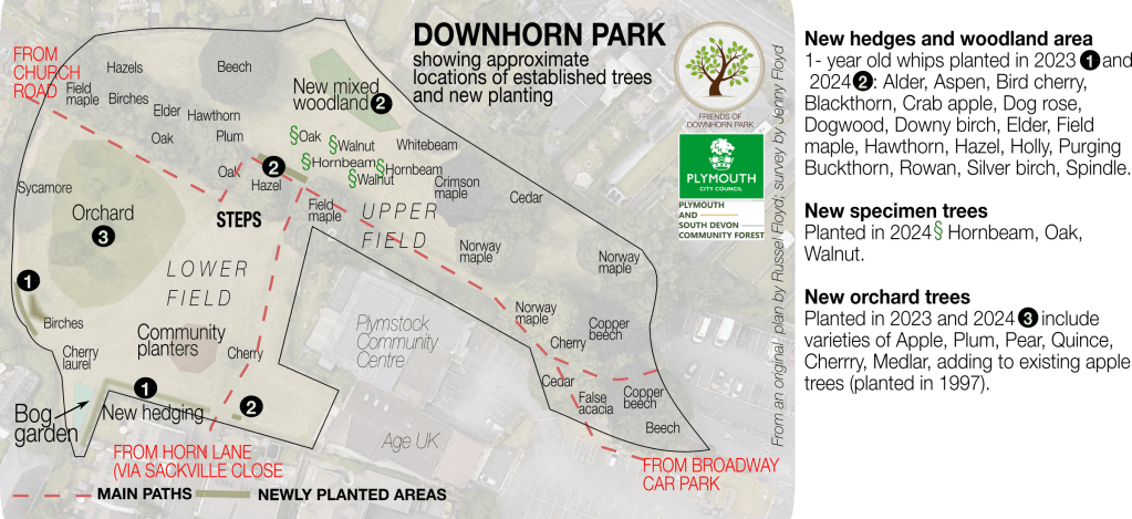 Downhorn Park contains a rich variety of trees. Many of these have developed naturally as part of the Devon hedge that separated the original farm fields, with some additions to replace gaps made around 2000. The mature specimen trees were planted in the Upper Field, shortly after its designation as public open space in 1967. Several of these have been lost in recent years due to disease and storm damage. The Community Orchard contains nine mature apple and two plum trees that were planted in 1967. Most of the original planting of 30 trees have died. In collaboration with the Plymouth and South Devon Community Forest project, the Friends of Downhorn Park are undertaking rejuvenation of the Orchard and extensive planting of hedges and trees. Urban trees have many benefits including: improving biodiversity, promoting health and well-being, and helping to mitigate the effects of climate change.